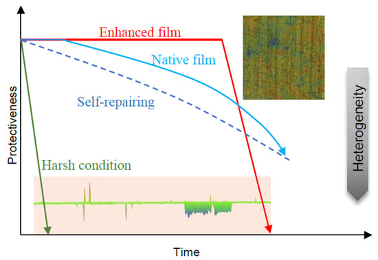 Schematic of critical step for three conditions of pitting: native film without protection under harsh condition (green), native film with excellent self-repairing properties (blue), and the corrosion-resistance enhanced ultrathin oxide film with weak self-repairing properties (red).