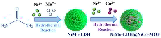 A total of 50 mg of NiMo-LDH powder was weighed and dispersed ultrasonically in a mixed solution of ethanol (10 mL), N,N-Dimethylformamide (10 mL), and deionized water (10 mL). Then, 0.75 mmol of trimesic acid (98%), 2 g of polyvinylpyrrolidone (k29-32), 0.25 mmol of Co(NO3)2 6H2O (98.5%), and 1.25 mmol of Ni(NO3)2 6H2O (98%) were added into the solution and stirred for half an hour to disperse the resulting solution. The solution was transferred to an autoclave and heated to 150 °C for 10 h. Once at room temperature, the sample was repeatedly rinsed with ethanol and finally dried overnight at 80 °C. The sample denoted as NiMo-LDH@NiCo-MOF. NiCo-MOF was prepared under the same reaction conditions. NiCo-MOF was obtained by the same procedure as mentioned above. The sample preparation flow chart is shown in Figure 1.