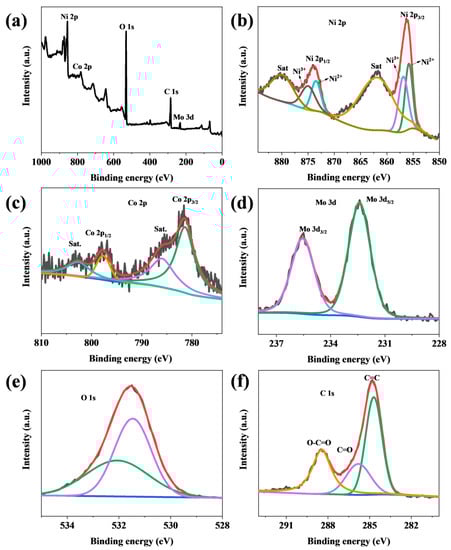 For the Co 2p spectrum (Figure 4c), the binding energies corresponding to the high peaks of Co 2p3/2 and Co 2p1/2 were 781.3 and 797.3 eV, respectively, which are consistent with the characteristic peaks of NiCo-MOF [10]. The vibrational satellite peaks corresponding to the binding energies at 786.1 and 803.1 eV indicate the presence of Co2+. Figure 4d shows that the spectrum of Mo 3d consists of two main peaks. The spin orbits of 232.02 and 235.17 eV are Mo 3d5/2 and Mo 3d3/2, respectively [15]. The two peaks of O 1s in Figure 4e at 531.2 and 533.1 eV correspond to metal–oxygen bonds in metal oxides and oxygen in hydroxyl ions, respectively. In addition, three distinct peaks of the C 1s spectrum are located at 284.7, 285.8, and 288.4 eV [11].