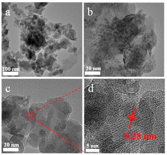 More information about the morphology and structure of NiMo-LDH@NiCo-MOF composites was obtained by TEM and HRTEM. Figure 5a,b shows TEM images at different magnifications. It can be observed from the TEM images at different magnifications (Figure 5a,b) that tiny NiCo-MOF particles are scattered over the 3D flower-like surface of NiMo-LDH. The spherical structure of the NiMo-LDH nanosheets was further revealed, and the spaces between the nanosheets can store electrolytes to shorten the diffusion distance. By scanning the sharp contrast between light and dark in the TEM image, the black spots shown are NiCo-MOF loaded on the NiMo-LDH nanosheets. From the HRTEM images (Figure 4d), it can be observed that the crystal-plane spacing at 0.28 nm perfectly matches the simulated (220) crystal plane of Co-MOF [21].