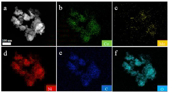 The element distribution of NiMo-LDH@NiCo-MOF was analyzed by energy dispersive X-ray spectroscopy (EDS). Figure 6a–f shows that the product is composed of Co, Ni, Mo, C, O, and other elements, and each element is evenly distributed. It is clear that Ni, Co, Mo, C, and O are evenly distributed across the surface of the flower. This is consistent with their SEM images.