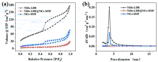 Compared to the single component, the suitable second-phase composite has a larger specific surface area. Nitrogen (N2) adsorption and desorption data were measured at 77 K to assess the specific surface area and porosity. As shown in Figure 8a, NiMo-LDH, NiCo-MOF, and NiMo-LDH@NiCo-MOF show H4 hysteretic rings, which proves the existence of a fractured pore structure. As can be observed from the figure, the specific surface areas of NiMo-LDH, NiMo-LDH@NiCo-MOF, and NiCo-MOF were 193.2, 49.0, and 15.4 m2/g, respectively, as measured by Brunauer–Emmett–Teller (BET). Among them, NiMo-LDH@NiCo-MOF can increase the larger specific surface area due to the unique nanoflower structure in close contact with the nanoparticles. The obtained size distribution (Figure 8b) shows that the pore volume peaks are in the mesoporous (2–10 nm) range, indicating that the pore structure of the sample contains a high number of mesopores [26]. When the electrode is in contact with the solution, the high number of mesopores shortens the adsorption distance between ions and facilitates the transport of electrolyte ions, allowing for high-charge storage and multiplication performance [27]. The abovementioned results indicate the successful synthesis of stable NiMo-LDH@NiCo-MOF composites. In addition, a strong interaction can be detected between NiMo-LDH and NiCo-MOF, which is conducive to structural stability and electron transfer through interface effects.