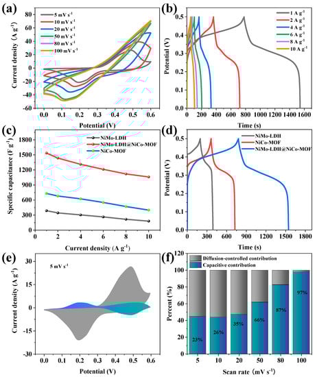 In order to investigate the pseudo-capacitance performance of NiMo-LDH@NiCo-MOF electroactive materials, CV and GCD were tested in 3M KOH aqueous electrolytes. Figure 9a shows the CV curves from a low to high sweep speed [28]. Under the condition of a low scanning rate, the symmetric curve shows that there is a reversible redox reaction at the electrode/electrolyte interface, indicating that the electrode has A·good pseudo-capacitance performance [29]. As the scanning rate of the extended region increases, the curve gradually deviates from the normal state, and the redox peaks shifts to both ends of the potential window due to the decrease in the interfacial resistance, indicating rapid electron transport and ion permeation process [30,31]. Figure 9b shows the change in potential over time in the charge–discharge curves of NiMo-LDH@NiCo-MOF, and the operating voltage can reach 0.5 V. The GCD curve shows two distinct charge/discharge platforms, proving that it is a Faraday process, which also supports the CV curve analysis [32,33]. When the current density is 1 A·g−1, the NiMo-LDH@NiCo-MOF electrode exhibits the highest capacitance and longest discharge time. The capacitance values gradually decrease with the increasing scan rate. The reason for the decline of specific capacitance values at a high current density is that the redox reaction cannot fully react inside the active material and the electrolyte ions cannot fully contact the active site during the rapid charge–discharge process, resulting in an insufficient redox reaction. When the current density increases from 1 to 10 A·g−1, it is calculated that the specific capacitance of the NiMo-LDH@NiCo-MOF electrode slowly decreases from 1536 to 1060 F·g−1 (Figure 9c). These results show excellent capacity retention. The NiMo-LDH@NiCo-MOF electrode exhibits a higher capacity retention of 69% at 10 A·g−1 with respect to the initial specific capacitance, which indicates that the NiMo-LDH@NiCo-MOF electrode has a significant multiplicative performance. This is because the flower-like, spherical structure of the NiMo-LDH@NiCo-MOF composite provides a large surface area, which not only facilitates the distribution of active sites, but also increases the contact area between the active electrode and electrolyte, further improving the energy storage performance of the supercapacitor at high current densities. It can be observed from Figure 9d that the potential of the charge/discharge curves exhibit typical pseudo-capacitance behavior over time. The calculated specific capacitances for NiMo-LDH, NiCo-MOF, and NiMo-LDH@NiCo-MOF at 1 A·g−1 are 388, 732, and 1536 F·g−1, respectively. Among them, NiMo-LDH@NiCo-MOF has the best specific capacitance and the longest discharge time among the three. Figure 9e shows the closed, shaded region indicating the non-diffusion control process. Because of the effect of polarization, a part of the shaded region is outside the original CV curve. As shown in Figure 9f, the contributions of the pseudo-capacitance and diffusion control are calculated as a proportion of the total capacitance based on the closed, shaded region. This suggests that the electrochemical reaction of NiMo-LDH@NiCo-MOF is determined by both capacitance and diffusion behavior. In addition, with the increase in the scanning rate, the contribution of the diffusion control process decreases significantly, and the redox reaction gradually dominates the charge storage process, indicating that the pseudo-capacitive charge storage is dominant in the specific capacity.