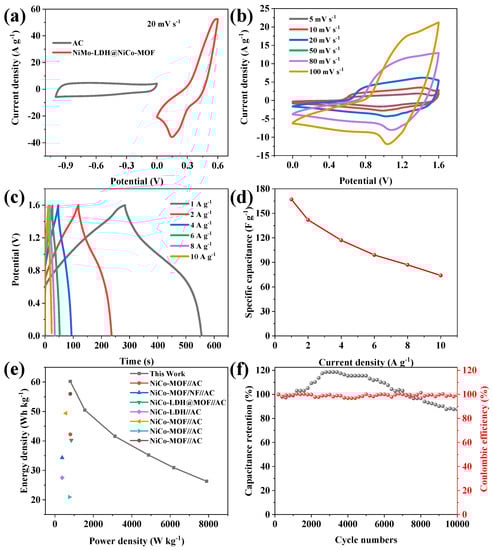 (a) CV curves of NiMo-LDH@NiCo-MOF and AC electrodes; (b) CV curve of NiMo-LDH@NiCo-MOF//AC; (c) GCD curves of NiMo-LDH@NiCo-MOF//AC; (d) specific capacitance of NiMo-LDH@NiCo-MOF//AC; (e) Ragone plot; (f) cyclic stability and coulomb effect diagram at 10 A·g−1.