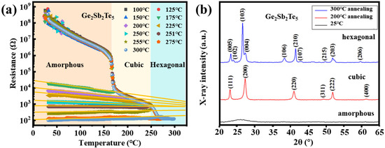 (a) The resistance–temperature curves of GST films annealed from 100 °C to 300 °C. (b) XRD patterns at 25 °C, 200 °C, and 300 °C, respectively.