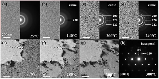 (a–d) The morphology and SAED patterns of GST films at 25 °C, 140 °C, 160 °C and 200 °C, respectively. (e–g) The morphology of GST films at 278 °C, 280 °C, and 300 °C, respectively. (h) The SAED patterns at 300 °C, which is along the [0001] axis.
