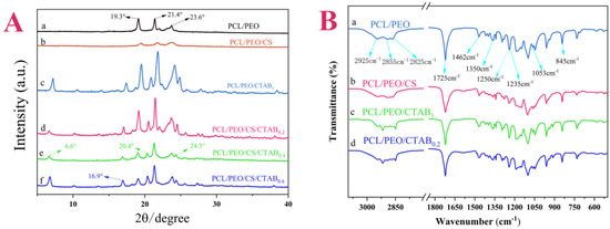 To determine whether the composite spun films were prepared successfully, XRD characterization tests were performed, and the results obtained are shown in Figure 3A. The XRD characteristic diffraction peaks of PCL were found to be at 21.4° and 23.7°, and the characteristic peaks of PEO were located at 19.3° and 23.6°, based on the literature [43]. The characteristic diffraction peaks of chitosan were at 8.6°, 11.8°, 18.5°, and 23.1° [44,45]. The resulting PCL/PEO samples showed three characteristic peaks at 19.3°, 21.4°, and 23.6°, indicating that they contained both PCL and PEO components. The PCL/PEO/CS samples showed distinctive peaks for the PCL and PEO components, and more spurious peaks between 30° and 50°, which were the result of a chemical bonding reaction between PCL and PEO and CS. The addition of CS was not significant, so the characteristic peaks were not obvious. The peak positions of PCL/PEO/CS/CTAB0.2, PCL/PEO/CS/CTAB0.4, and PCL/PEO/CS/CTAB0.6 were consistent with each other, and only the peak intensities changed due to the different additions of CTAB, which led to different crystallinity of the prepared samples. The peak positions of CTAB were 6.6°, 16.9°, 20.4°, and 24.3° [46]. The XRD peak positions of PCL/PEO/CTAB1 were shifted to the left in comparison with the peaks of the three samples. There was a deviation in the thickness of the three materials and the sample was higher than the reference surface of the sample plate, resulting in the leftward shift of the diffraction peak [47], which was CTAB. In summary, the analysis tentatively concluded that the six composite films were prepared successfully.
