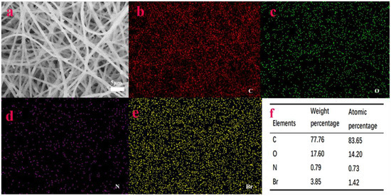 Since the compositions of the three composite films PCL/PEO/CS/CTAB0.2, PCL/PEO/CS/CTAB0.4, and PCL/PEO/CS/CTAB0.6 were the same, only the ratios were different. FT-IR image analysis was performed for these four composite films to further analyze the internal composition of the samples. From Figure 3B, it can be seen that the spectral curves of a, b, c, and d were the same, and the locations where the absorption peaks appeared were the same, which could be identified as the characteristic absorption peaks of the PCL and PEO substrate polymers. Among them, 1725 cm−1 was the C=O stretching vibration peak [48], 2925 cm−1 and 2855 cm−1 were the methylene C-H stretching vibration peaks, and 1053 cm−1 to 1235 cm−1 were the C-O stretching vibration peaks, while 1350 cm−1 to 1462 cm−1 were the methylene C-H in-plane bending vibrations [47]. It can be seen that the molecular chains contained ester-based structures, as well as more hydroxyl units. This was the characteristic absorption peak of PCL polymers; while 845 cm−1 was the -CH2-CH2 stretching vibration peak, 1053 cm−1 to 1235 cm−1 was the C-O stretching vibration peak [49]. 1250 cm−1 was the -OH stretching vibration peak [50], 1725 cm−1 was the C=O stretching vibration peak, and 2855 cm−1 was the methylene C-H stretching vibration peak. These were the characteristic absorption peaks of PEO polymers. Because PCL and PEO components were present in each composite film, the characteristic absorption peaks of PCL and PEO appeared in all six composite films at these three locations. The small content of chitosan led to the overlap of the characteristic absorption peaks of the IR spectra with the other peaks, which can assist in inferring the presence of CS by the difference in antibacterial properties in the subsequent antibacterial experiments. In the IR spectra of PCL/PEO/CTAB1 and PCL/PEO/CS/CTAB0.2, no stretching vibration peak of C-Cl appeared. The relative atomic mass of halogenated hydrocarbons is very large, the infrared spectrometer is not stable in the detection of the stretching vibration of halogenated hydrocarbons, and the accuracy of the test results is low. Therefore, the successful doping of CTAB could not be proven in the IR spectrum, so the presence of elemental Br was detected using Mapping. The test results, shown in Figure 4, proved the presence of C, O, N, and Br elements in the structure of PCL/PEO/CS/CTAB0.2 and the uniform distribution of the elements, which proved the successful incorporation of the CTAB antimicrobial component.