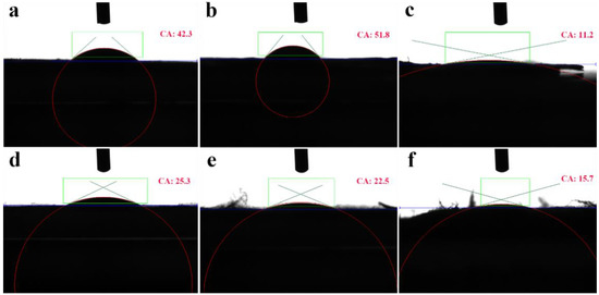 Water contact angle images of composite spinning films: (a), PCL/PEO; (b), PCL/PEO/CS; (c), PCL/PEO/CTAB1; (d), PCL/PEO/CS/CTAB0.2; (e), PCL/PEO/CS/CTAB0.4; (f), PCL/PEO/CS/CTAB0.6.