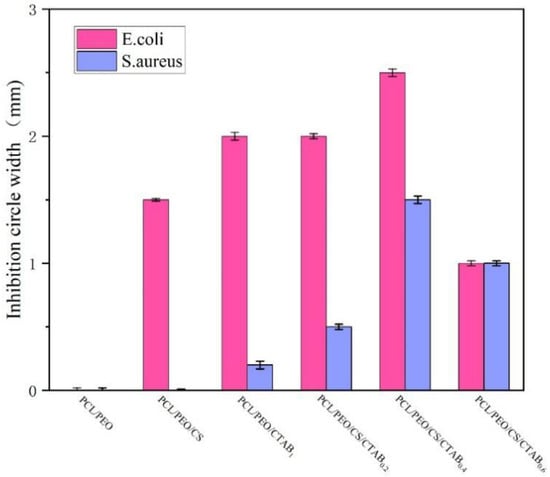 It can be observed from Figure 6 and Figure 7 that PCL/PEO had no effect on Gram-positive and Gram-negative bacteria. This is because PCL/PEO does not contain antimicrobial agents that have an inhibitory effect on bacteria. Chitosan in PCL/PEO/CS has low antibacterial activity against S. aureus, with an inhibition zone width of 1 mm, and no effect on E. coli, which is due to the low chitosan addition and the fact that chitosan is an antimicrobial agent of natural origin that has a poor antibacterial effect. PCL/PEO/CTAB1 had a low antibacterial activity against S. aureus, with an inhibition zone width of 2 mm, and a zone of 0.2 mm against E. coli. The inhibition zone of PCL/PEO/CS/CTAB0.2 against S. aureus was 2 mm, while it was 0.2 mm against E. coli, while the inhibition zone of PCL/PEO/CS/CTAB0.2 against S. aureus was 2 mm, and it was 0.5 mm against E. coli. The inhibition effect of the composite films against E. coli was slightly enhanced by the addition of chitosan. The inhibition zone of PCL/PEO/CS/CTAB0.4 against S. aureus was slightly enhanced by the addition of chitosan. The width of the inhibition zone of PCL/PEO/CS/CTAB0.6 was 1 mm for S. aureus and 1 mm for E. coli when the amount of CTAB added was in a certain range. The contact area became larger, resulting in a reduction in the diameter of the inhibition circle.