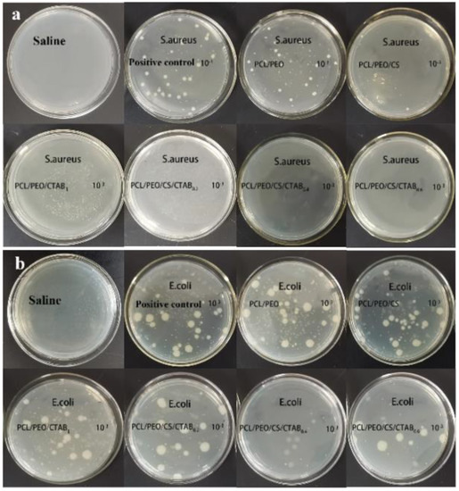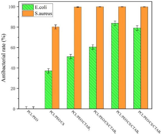 The antibacterial results of each composite spinning film against S. aureus and E. coli after treatment are shown in Figure 8 and Figure 9, from which it can be seen that, except for PCL/PEO composite films with no antibacterial activity, the rest of the composite films had a degree of antibacterial activity, and the antibacterial activity against the two strains was different. The antibacterial activity against Gram-positive bacteria (S. aureus) was higher, with the antibacterial rate was generally above 80%, while the antibacterial rate against Gram-negative bacteria (E. coli) was generally lower, which was also consistent with the results shown in the inhibition circle experiment. Although the peptidoglycan layer of Gram-positive cells is thicker than that of Gram-negative bacteria, the outer film of Gram-negative bacteria is surrounded by lipids and proteins, which can improve their resistance to the penetration of cationic antimicrobial polymers into the cells. On the other hand, the surface of Gram-positive bacteria has more negative charges, which makes them more resistant to the penetration of cationic antimicrobial polymers. It can be seen from the graph that PCL/PEO/CS/CTAB0.4 had the highest antibacterial rate of 83.7% for S. aureus and 99.9% for E. coli, which was due to the higher amount of antimicrobial agent in this composite film. However, the antimicrobial rate decreased. This was because there is a certain effective range for the amount of CTAB added, and when too much is added, the composite film becomes loose and the area of CTAB in contact with air becomes larger. Some is then lost, resulting in a decrease in the inhibition rate. This also corresponded to the experimental results of the inhibition circle.