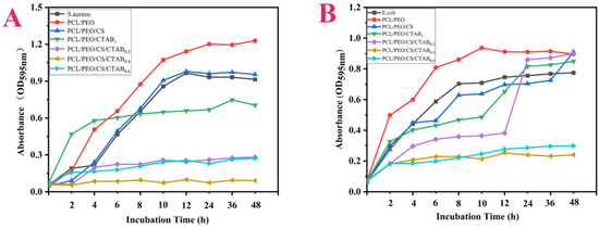 Inhibitory growth curves of composite spinning films: (A) E. coli; (B) S. aureus.