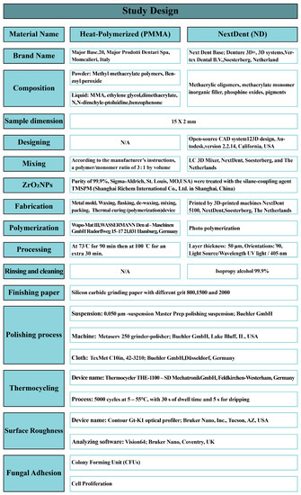 One of the most frequently used substances for fabricating complete or partial denture prostheses is poly(methyl methacrylate) (PMMA). PMMA is mainly used because of its biocompatibility, good aesthetics, ease of handling, and low cost [1]. However, PMMA has some disadvantages, such as polymerization shrinkage, low strength, low wear resistance, and, most importantly, high vulnerability to microbial and fungal colonization [2,3].