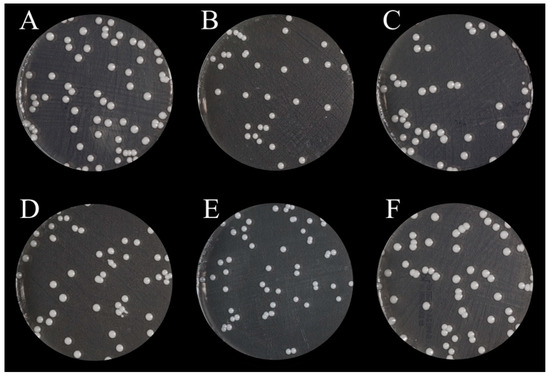 CFU images of the tested groups, showing the growth of adherent C. albicans in each group: (A) heat-polymerized PMMA, control group; (B) NextDent group with 0% ZrO2 NPs; (C) NextDent group with 0.5% ZrO2 NPs; (D) NextDent group with 1% ZrO2 NPs; (E) NextDent group with 3% ZrO2 NPs; (F) NextDent group with 5% ZrO2 NPs.