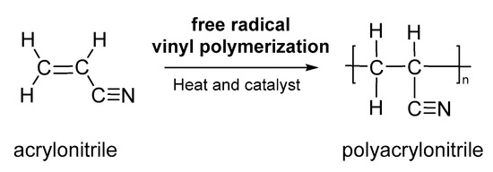 PAN and copolymers of PAN are polymers with versatile and multipurpose applications. Due to its high carbon yield (up to 56%), PAN is used as a carbon fiber precursor, and taking into account that it has interesting chemical, mechanical and thermal properties that allow for electrospun nanofibers and prepare carbon nanostructure microspheres. Nanocomposite fibers and polyacrylonitrile blends can be used in the manufacture of protective materials, technical textile, air filtration material, antimicrobial nanofibers spun for water treatment, electrochemical sensors, drug delivery, among others [48,49]. PAN can be synthesized by free radical vinyl polymerization (Figure 5), heat or by a catalyst from acrylonitrile monomer and was marketed by DuPond as-spun fiber around 1941 [48]. This polymer can also be synthesized by atom transfer radical polymerization, radicals catalyst and anionic polymerization with butyllithium that yield atactic polymers [49,50,51,52]. Due to its high carbon yield (up to 56%), PAN is used as a carbon fibre precursor, nanoparticles by the dispersion/emulsion polymerization process, electrospun nanofibers and carbon nanostructure microspheres with several applications such as antimicrobial nanofibers spun for water treatment, electrochemical sensors, supercapacitors materials, drug adsorption and air filtration media [52,53,54,55,56,57].