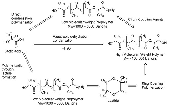 Lactic acid is the building block for the polymerization of PLA. The synthesis can be performed by different methods as direct condensation polymerization and polymerization through lactide formation and azeotropic dehydration condensation (Figure 9) [81,82]. The enantiomers of lactic acid (L-(+)-LA and D-(-)-LA) are employed indistinctly in industrial production, and the polymer obtained is classified as an aliphatic polyester due to ester bonds that connect the monomer units. This structural characteristic plays a key role in non-toxic degradation process, applications in biomedical field and development of renewable and biodegradable materials [83]. However, the convenient mechanical and thermal properties allow for the development of nanofibers prepared by electrospinning that have morphological and structural features for biological applications like a scaffolds for tissue engineering, nanofibers of thin films of PLA/paclitaxel as molecular carriers for the sustained release of cancer therapeutics and electrospun PLA-cyclodextrins composite for Simultaneous High-Efficiency PM and VOC Removal [84,85,86,87].
