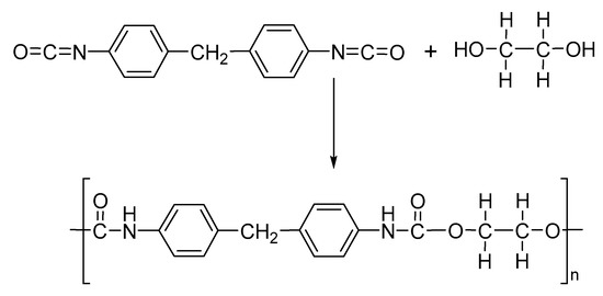 PU are synthesized in a single step by reacting diisocyanates, polyols and catalyst as DABCO, metallic soaps or dibutyltin dilaurate (Figure 11) [95,96]. The main aliphatic isocyanates for the synthesis of PU are diphenylmethane diisocyanate (MDI) or toluene diisocyanate (TDI), hexamethylene diisocyanate (HDI) or isophorone diisocyantate (IPDI). However, the polyols can be polyether polyols and polyester polyols as ethylene glycol, propylene glycol, poly-ethylene propylene oxide, 1,4-butane diol and 1,6-hexane diol [97]. PU shows important types of applications and the development of versatile materials as thermoplastics, foams, powder coatings, paints, elastomers, and insulators [98,99,100]. However, the preparation of polyurethane nanofibers by electrospinning is a field of interesting study, due to vast possibilities for functionalization with high surface area to volume or mass ratio, ease of use, adaptability and potential applications in biomedical, filtration technologies, sensors and nanoweb lamination based on electrospun PU polymer nanofibers [97,101,102,103].