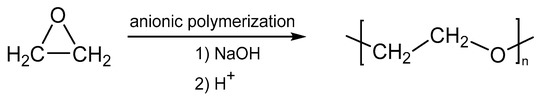 PEG, also known as polyethylene oxide (PEO) or polyoxyethylene (POE), depending on its molecular weight, is an polyether polymer, initially produced by the reaction of ethylene oxide with water, ethylene glycol, or ethylene glycol oligomers (Figure 12) [104]. The reaction is a catalyst by alkalis or metal oxides that affect the low polydispersity and growing polymer chain in the polycondensation process [105]. Additionally, these polymers also are considered green organic solvents, and are promising solvents for sustainable organic synthesis [106] and have been used for the development of eco-friendly reactions [107]. PEG have also been used to prepare novel PEG derivatives as PEGylated−peptide biopolymer conjugates, hydrogels of PEG/DEPEG, PEG-tosylate, -mesylate, -bromide or aldehyde and HS–PEG–alkyne [105,108,109,110,111].