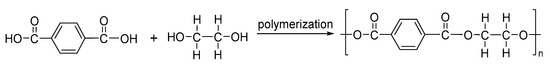PET is a thermoplastic polymer widely used to make plastic bottles, polyester yarn, microfiber towels, cleaning cloths and a wide variety of plastic products. PET can be synthetized by the direct reaction of Fischer esterification between terephthalic acid and ethylene glycol or transesterification reaction where one ester is transformed into another by reacting dimeth ylterephthalate with ethylene glycol (Figure 13) [117]. A big problem with the production of PET is that it uses large amounts of derivatives of petroleum, making it an environmentally unfriendly polymer [118,119]. In response to the potential polymer pollution several applications have been proposed by chemical and mechanical recycling [120,121,122,123]. In this sense, recycling of PET has been studied for the development of aggregates such as the synthesis of copolyesters (PET/poly-Ɛ-caprolactone), synthesis of PET from biomass-based in ethylene glycol and glycolysis [124,125,126,127]. Different types of PET nanofibers have been developed with different applications, for example PET/SiO2 nanofibers membrane for applied to needle-felt filters, PET nanofibers loaded with silver nanoparticles for antimicrobial applications, PET nanofibers chemically modified with silane molecules for electroless deposition methods with copper and PET nanofibers as new adsorbent for micro-solid phase extraction of chromium(vi) in environmental water samples [128,129,130,131].