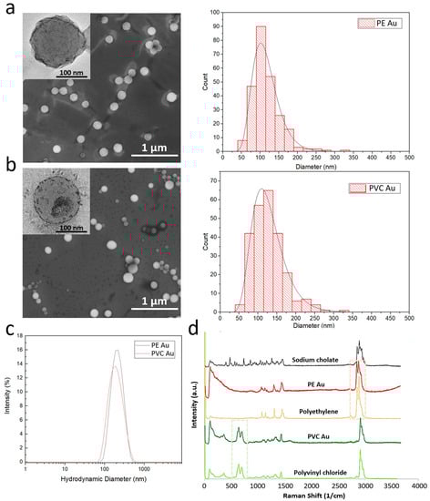 Scanning electron microscopy images of gold-doped polyethylene and polyvinyl chloride nanoplastics (images (a,b), respectively) and their mean diameter distribution, evaluated by the manual measurement of a diameter of at least 200 particles. The insets show a high-magnification transmission electron microscopy image of the single nanoplastics, in which the ultrasmall gold nanoparticles are visible as small dark spots. (c) DLS size intensity spectra of PE Au (blue line) and PVC Au (red line) samples, dispersed in MilliQ water. (d) Raman spectra of polypropylene and polyvinyl chloride polymers powders, sodium cholate hydrate powder, and PE Au and PVC Au samples.