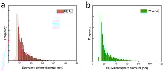 Figure 2 shows the equivalent sphere diameter distributions of PE Au and PVC Au, obtained through ICP-MS analysis in single-cell operating mode. As shown in Figure S1 in the Supplementary Materials, counts below 20 nm of equivalent diameter are also detected in the blanks; hence, these values could be used qualitatively to identify the minimum detectable diameter. Both the distributions are asymmetric with respect to the maximum frequency, and appear broad, with mean diameters and standard deviations of 26.1 ± 6.4 nm for PE Au (Figure 2a) and 24.8 ± 5.8 nm for PVC Au (Figure 2b). The histograms were built on a total of N = 1471 and N = 1649 counts for PE Au and PVC Au, respectively.
