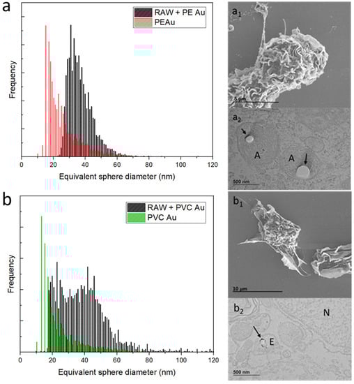 (a) Equivalent sphere diameter distribution of PE Au (red) and RAW 264.7 cells, incubated with PE Au for 48 h (black) at a concentration of 1 µg mL−1. (a1) The SEM image of the RAW 264.7 cells incubated with PE Au for 48 h does not show the presence of any nanoplastics interacting with the cell membrane or as background materials. (a2) TEM image of slices of RAW 264.7 cells after 48 h of incubation with PE Au, displaying the presence of PE Au (arrows) inside amphisomes (A), confirming the internalization. (b) Equivalent sphere diameter distribution of PVC Au (green) and RAW 264.7 cells incubated with PVC Au for 48 h (black) at a concentration of 1 µg mL−1. (b1) The SEM image of the RAW 264.7 cells, incubated with PVC Au for 48 h, does not show the presence of any nanoplastics interacting with the cell membrane or as background materials. (b2) The TEM analysis of the sample reveals the presence of nanoplastics (indicated by arrows) internalized inside the endosome (E); the nucleus is marked N.
