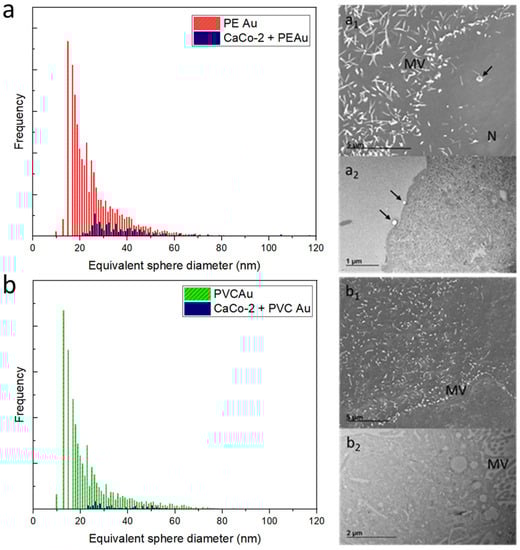 (a) Equivalent sphere diameter distribution of PE Au (red) and CaCo-2 cells incubated with PE Au for 48 h (blue) at a concentration of 1 µg mL−1. (a1) The SEM image of CaCo-2 cells incubated with PE Au for 48 h does not show the presence of any nanoplastics inside the cells, yet some nanoplastics (arrow) are clearly interacting with the cell membrane andmicrovilli (MV); nucleus (N). (a2) TEM image of slices of CaCo-2 cells after 48 h of incubation with PE Au, displaying the presence of PE Au (arrows) interacting with the cellular membrane, confirming the results of the SEM analysis. (b) Equivalent sphere diameter distribution of PVC Au (green) and CaCo-2 cells incubated with PVC Au for 48 h (blue) at the concentration of 1 µg mL−1. SEM (b1) and TEM (b2) analysis of the sample did not reveal the presence of nanoplastics, either internalized within the cells or externally interacting with the cell membrane or as a free background material.