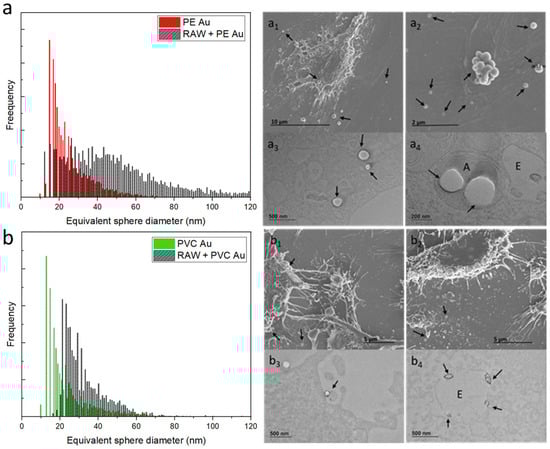 (a) Equivalent sphere diameter distribution of PE Au (red) and RAW 264.7 cells incubated with PE Au for 48 h (black) at a concentration of 100 µg mL−1. (a1,a2) The SEM image of the RAW 264.7 cells, incubated with PE Au for 48 h, reveals the presence of nanoplastics, both interacting with the cell membrane and as background materials. (a3,a4) The TEM image of the slices of RAW 264.7 cells after 48 h of incubation with PE Au, displaying the presence of PE Au (arrows), confirming the internalization into the amphisomes (A). (b) Equivalent sphere diameter distribution of PVC Au (green) and RAW 264.7 cells, incubated with PVC Au for 48 h (black) at a concentration of 100 µg mL−1. Both the SEM (b1,b2) and TEM (b3,b4) analyses of the sample display the presence of nanoplastics, both internalized and interacting with the cell membrane or as a background material. Particles are visible on the cell membrane and inside the endosome (E), also confirming the presence of Au NPs inside PVC Au by TEM (arrows).
