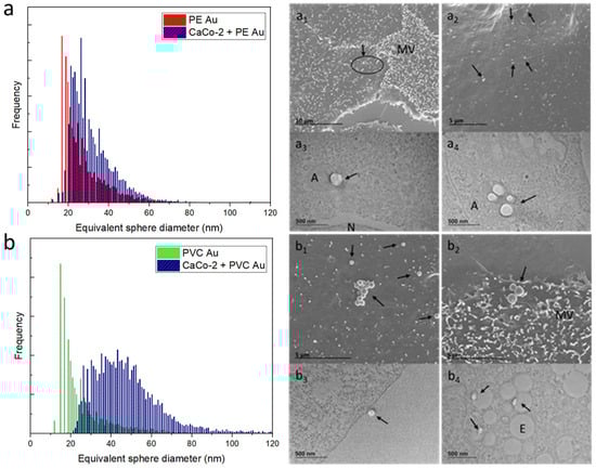 (a) Equivalent sphere diameter distribution of PE Au (red) and CaCo-2 cells, incubated with PE Au for 48 h (black) at a concentration of 100 µg mL−1. (a1,a2) SEM images of CaCo-2 cells incubated with PE Au for 48 h reveals the presence of nanoplastics both interacting with the cell membrane and microvilli (MV) (arrows). (a3,a4) The TEM images of slices of CaCo-2 cells after 48 h incubation with PE Au, displaying the presence of PE Au (arrows), confirming the internalization in the amphisomes (A); nucleus (N). (b) Equivalent sphere diameter distribution of PVC Au and CaCo-2 cells, incubated with PVC Au for 48 h at a concentration of 100 µg mL−1. Both SEM (b1,b2) and TEM (b3,b4) analyses of the sample display the presence of nanoplastics (arrows), both internalized and interacting with the cell membrane. Particles are visible inside the endosome (E) also confirming the presence of Au NPs via TEM.