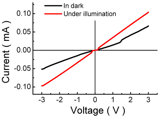 Current-voltage (I-V) curves of MP1D film in dark and under illumination.