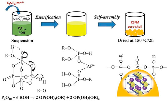 Nguyen et al. [35] prepared red K2SiF6: Mn4+ (KSFM) phosphors by the two-step co-precipitation method and added KSFM to the solution of Al(NO3)3, P2O5, and CH3OH (M). Figure 4 shows the synthesis diagram of KSFM-MOPAl. Al3+ ions act as the cross-linking agent between alkyl groups, and the P-O bond is broken and partially replaced by alkyl groups, forming a M-O-P-O-M bond and generating an organophosphorus layer. Through the adsorption mechanism, a network is formed on the surface of KSFM, and KSFM-MOPAl is obtained. Zhou et al. [36] added K2TiF6: Mn4+ to octadecyl trimethoxysilane and collected K2TiF6@ODTMS after stirring vigorously for 2 h. Kim et al. [37] introduced different silane materials via mixing with steam of isopropyl alcohol (IPA) and ammonium hydroxide (NH4OH) into the plasma reactor, respectively. After 20 min of plasma treatment, modified K2SiF6: Mn4+(KSFM) was obtained. Arunkumar et al. [38] dissolved oleic acid (OA) in absolute ethanol, added K2SiF6: Mn4+, dispersed it in the above solution for 1 h, then heated the mixed solution in a reaction kettle at 140 °C for 6 h. Finally, KSF-OA with a shell structure was formed. Fang et al. [37] used HF to remove impurities and small particles on the surface of K2TiF6: Mn4+(KTF) by the surface etching method, so that the surface of KTF was smooth. OA and SiO2 coatings were constructed by the hydrothermal method and the stirring method at room temperature to obtain a double-coated structural material, namely, KTF@OA@SiO2. Luo et al. [40] added K2SiF6: Mn4+ to pyruvate (PA, 98%), stirred it for 6 h, washed it with ethanol, and dried it to obtain KSRM-98PA. PA first reacted with Mn4+ on the surface to construct a Mn4+-free layer on the surface. In addition to reduction, PA could also form a soft shell on the fluoride surface through chemical bonds, which could prevent Mn4+ from reacting with water molecules on the surface.