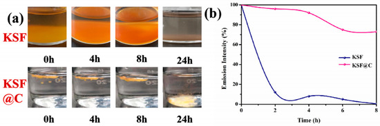 Yu et al. [47] synthesized (i) K2SiF6: Mn4+, (ii) K2SiF6: Mn4+, Na+, (iii) K2SiF6: Mn4+, Na+@GQDS, and (iv) K2SiF6: Mn4+, Na+@GQDs@K2SiF6 by the hydrothermal method and the room temperature coating method. The PL intensity values of (ii), (iii), and (iv) were 1.21, 1.47, and 1.71 times that of (i), respectively, which means that Na+ co-doping, GQDs, and KSF shells could further enhance the emission intensity of the samples. At 180 °C, (iii) and (iv) had obvious NTQ effects because their PL intensity values at 180 °C were 217% and 298% of that at 30 °C, respectively. The mechanism of NTQ was further regarded as thermo-optic energy conversion. After being immersed in deionized water for 360 min, the emission intensities of (iii) and (iv) decreased from 100% to 70.57% and 91.63%, respectively. The water resistance of KSFM with a double coating structure improved significantly. As shown in Figure 11, the K2SiF6: Mn4+@C phosphor synthesized by Liu et al. [48] could maintain 73% of the initial luminescence intensity after soaking in aqueous solution for 8 h at room temperature, while K2SiF6: Mn4+ was only 0.7% of the initial value under the same conditions. Although the C deposition layer could improve the water-resistance of KSF, it also decreased the luminescence intensity of KSF.