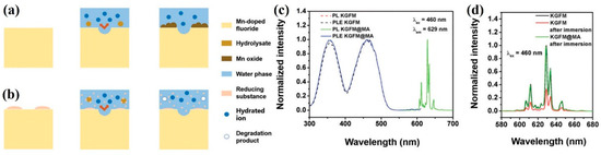 (a) Schematic diagram of water corrosion of K2GeF6: Mn4+ and (b) K2GeF6: Mn4+@MA; (c) normalized excitation emission spectra for K2GeF6: Mn4+ and K2GeF6: Mn4+@MA; (d) normalized emission spectra of K2GeF6: Mn4+ and K2GeF6: Mn4+@MA before and after immersion in water for 168 h. (Reprinted from Ref [49]. Copyright from Royal Society of Chemistry, 2018).