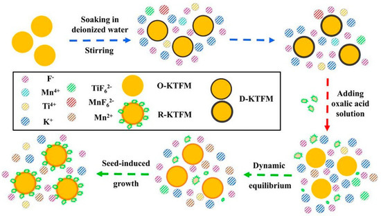 Yu et al. [53] added K2GeF6: Mn4+ into oxalic acid solution and stirred for 12 h. The interface between K2GeF6: Mn4+ and the solution was ionized, releasing K+ ions, [GeF6]2−, and [MnF6]2−, where [MnF6]2− was reduced to Mn2+. The free [GeF6]2− anion was combined with K+ ions to form K2GeF6, which was deposited on the surface of K2GeF6: Mn4+ to form K2GeF6: Mn4+@K2GeF6(T-KGF). Jiang et al. [54] added Rb2SnF6: Mn4+ to the oxalic acid solution, and they stirred and passivated Rb2SnF6: Mn4+ with oxalic acid to construct a passivation protective layer on the surface of. Liu et al. [55] employed the “good from bad” method to prepare R-KSFM by hydrolyzing the commercial K2SiF6: Mn4+ (O-KSFM) phosphors in deionized water for 10 min and then poured the oxalic acid solution into the above solution and stirred for 1 h. The collected R-KSFM not only fully recovered the luminescence properties but also possessed high moisture resistance. Li et al. [56] synthesized bicentric ions CsNaGe0.5Sn0.5F6: Mn4+(CNGSF) phosphors by the ethanol crystallization method. CNGSF was added into the weak reducing agent solution composed of citric acid or oxalic acid, and then stirring was carried out for the production of P1-CNGSF and P2-CNGSF samples. Zhong et al. [57] added the prepared Na2SiF6: Mn4+, Li+ (LNSF: Mn4+) into the KF-HF solution and stirred it; then they added aqueous citric acid solution and maintained stirring for 12 h to obtain the product of LNSF: Mn4+ with a shell layer (LNSF: Mn4+-CA). A protective layer with low solubility was in situ-formed on the surface, which could effectively isolate Mn4+ from the aqueous layer and help to improve the waterproof performance of LNSF: Mn4+-CA. In order to achieve the in situ formation of K2SiF6 on the surface of the K2SiF6: Mn4+ red phosphor particle, Cai et al. [58] put K2SiF6: Mn4+ phosphor into FeCl2 solution and utilized Fe2+ as a reducing agent to produce T-KSF phosphor with excellent water resistance. Wan et al. [29] proposed the new idea of reconstructing Mn4+-free shells of fluoride by reduction-assisted surface recrystallization (RSRC). The synthesized K2SiF6: Mn4+ was added to a reducing agent containing α-hydroxyl groups, such as L-tartaric acid (TA), DL-malic acid (MA), citric acid (CA), ascorbic acid (AA), or DL-lactic acid solution (LA), forming saturated K2SiF6 solution and stirring for 2 h to obtain serial phosphors. During the dissolution–crystallization equilibrium process of fluoride crystallization in HF, the reducing agent removed Mn4+ ions from the solution to prevent Mn4+ from re-entering the surface of the fluoride crystals to construct a Mn4+-free shell. Specifically, Huang et al. [28] constructed K2TiF6: Mn4+@K2TiF6 phosphors with a uniform coating core–shell structure based on the reverse cation exchange reaction. K2TiF6: Mn4+ microcrystals were synthesized by replacing Ti4+ ions in K2TiF6 crystals with Mn4+ ions in HF solution. Notably, the cation exchange process was reversible in nanocrystals. This reverse process was also applicable to K2TiF6: Mn4+ crystals. Using K2TiF6 as raw material, Ti4+ ions replaced Mn4+ of K2TiF6: Mn4+ in HF solution, leaving the K2TiF6 shell to protect the internal K2TiF6: Mn4+ core from ambient moisture and to prevent hydrolysis of [MnF6]2−.