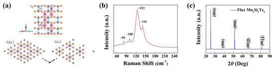 Mn3Si2Te6 has a trigonal crystal structure (spatial group No. 163), as shown in Figure 1a [42]. Mn3Si2Te6 consists of MnTe6 octahedrons that share edges within the ab plane (Mn1 site) and, together with Si-Si dimers, form layers of Mn3Si2Te6. Similar to CrSiTe3, which is hexagonal and has a vdWs gap between layers, the layered framework is hexagonal. Nonetheless, Mn3Si2Te6 is composed of layers connected by Mn atoms at the Mn2 site, and these layers fill one-third of the octahedral holes within the vdWs gap to form Mn3Si2Te6 [43]. Importantly, Mn1 has twice the multiplicity of Mn2 in comparison. In the unit cell, the lattice constants are a = b = 7.029 Å, and c = 14.255 Å. The Raman spectra (LabRAM HR Evolution, HORIBA, Villeneuve d’Ascq, France) of Mn3Si2Te6 thin films are shown in Figure 1b, and a 532 nm laser is used as the excitation source in this characterization process. The four characteristic Raman peaks are identified at ~81 cm−1, ~100 cm−1, ~123 cm−1, and ~141 cm−1, respectively. This is different from the Raman data reported in the reference [44], and it could be attributed to detecting under different pressures. The characteristic peaks of the Raman spectrum of materials will be affected by the environment in which the materials are located. In ref. [44], the Raman spectrum of Mn3Si2Te6 is measured under high pressure, whereas in this work it is measured under normal temperature and pressure, so there are differences. Figure 1c displays the main XRD spectra (AXS D8 Advance, Bruker, Billerica, MA, USA) characteristic peaks of high-crystallinity Mn3Si2Te6. It matches the rhombohedral structure in space group P-3c1 (PDF # 01-074-1322). The peaks are (004), (006), (008), (00), and (00) respectively in Mn3Si2Te6. The Mn3Si2Te6 crystal is verified by the (00L) Bragg peaks, and the lattice parameters are determined as a = b = 7.03 Å and c = 14.26 Å by the powder X-ray diffraction of crushed crystals, which is consistent with previous reports [45].