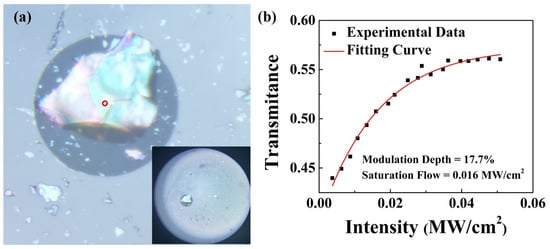 To study the nonlinear saturable optical absorption properties, the mechanically stripped Mn3Si2Te6 nanosheet is transferred onto the end face of the fiber [47]. The specific dry transfer process is simple and convenient. First of all, the Mn3Si2Te6 bulk was thinned by mechanical exfoliation with blue tape. When a suitable nanosheet has been identified, the underlying fiber end face is fixed on the moving stage. Finally, the tape is pressed against the fiber end face and peeled off very slowly. Figure 3a depicts the end face of the fiber following material transfer. Due to repeated mechanical stripping, in addition to the large nanosheet covering the fiber core, most of the surrounding nanosheets are small in size. The core position is completely covered by Mn3Si2Te6 nanosheets and has been marked by red circles. The optical source of the two-arm detection system [48] is a pulsed laser with an operating wavelength of 1550 nm, a repetition frequency of 16.6 MHz, and a pulse duration of 448 fs.