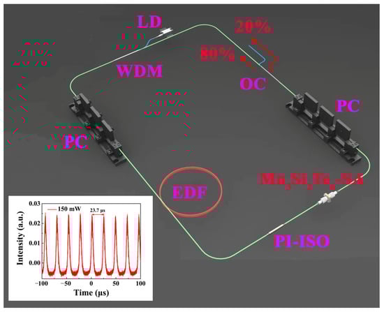 Figure 4 shows the set-up diagram of the pulsed EDF laser that is based on Mn3Si2Te6 SA, where the laser cavity has a ring-shaped design. Through 980/1550 wavelength division multiplexing (WDM), a 976 nm CW laser launched by a laser diode with the maximal power of 400 mW is coupled into the laser cavity as a pump. A 6-m-long EDF (LIEKKI: Er110-4-125) acted as the gain medium. The prepared Mn3Si2Te6 SA is integrated into the laser cavity after the EDF. For unidirectional laser cavity operation, a polarization independent isolator (PI-ISO) is employed. The polarization state of circulating light is optimized using two polarization controllers (PCs). In the experimental operation, one PC always stays still and tunes only the other PC. Additionally, 20% of the pulsed laser power from the cavity is extracted by an optical coupler (OC). The cavity is approximately 11 m long, containing the EDF and tail fibers. A digital oscilloscope (Keysight DSOS104A, 1 GHz, USA), a spectrum analyzer (Yokogawa AQ6370D, Japan), and a power meter (Thorlabs DET08CFC/M, 5 GHz, USA) are utilized to determine the pulse trace, output spectrum, and average output power. The optical fiber is purchased from Yangtze Optical Fibre and Cable Joint Stock Limited Company (YOFC), and the optical fiber devices are purchased from CSRayzer Optical Technology. The illustration in Figure 4 shows the pulse trace at a pump power of 150 mW.