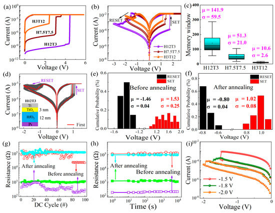 (a,b) Formation characteristics and bipolar resistive switching of the HfO2/TiOx memristor with different sublayer thickness ratios from 4/1 to 1/4, including the devices named H12T3, H7.5T7.5, and H3T12; (c) memory window distribution of the HfO2/TiOx memristors with different sublayer thickness ratios from 4/1 to 1/4, including the devices named H12T3, H7.5T7.5, and H3T12; (d) I-V characteristics of the H12T3 memristor after annealing; (e,f) statistical distribution of the set/reset voltage for the H12T3 memristor before and after annealing; (g,h) endurance and retention characteristics of the H12T3 memristor before and after annealing; (i) multilevel I–V characteristics of the RRAM device under different reset voltages.