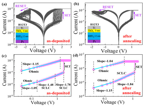(a,b) Resistive switching characteristics of HfO2/TiOx RRAM (H12T3) before and after annealing; (c,d) set process characteristics of the H12T3 device before and after annealing replotted in double logarithmic scales.