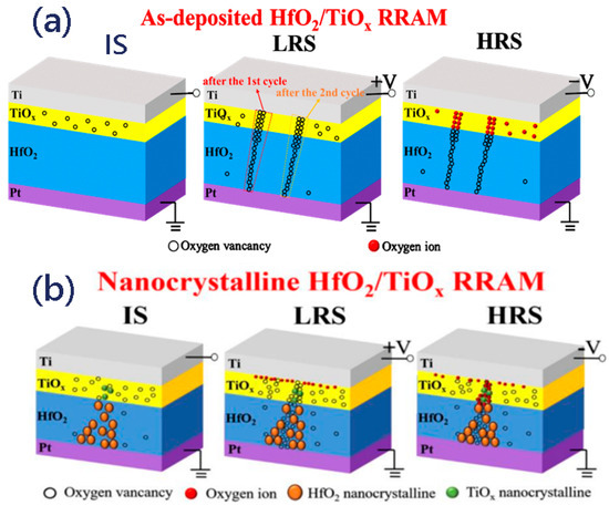 (a,b) Schematic resistive switching model of as-grown HfO2/TiOx memristor with thickness ratio of 1/4 and 1/1 corresponding to HfOx and TiOx sublayer, respectively.