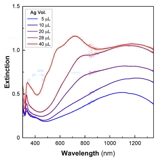 The different shell morphologies obtained using a seed-mediated approach are quite surprising, as they are very different from those of thin [43] or ultrathin [44,45] gold shells made from gold-seeded silica particles. In solution-based mechanisms, the regrowth of the seeds results in the formation of isolated gold islands that later merge into a shell (Au scheme) [43]. Alternatively, the homogenous growth of the seeds from a gaseous reducing agent forms continuous, yet slightly bumpy, nanoshells [44]. Here, the very smooth metallic surfaces obtained over a large area suggest another synthesis mechanism, which was studied by producing particles using different amounts of silver nitrate to regrow the shell. The optical properties of these particles were studied by UV–Vis–NIR spectroscopy (Figure 3). For the smallest volume of silver -nitrate solution used (four times less than that of the particles shown in Figure 2), we observed a wide peak centered at 1100 nm. With increasing quantities of silver, the resonance progressively blueshifted, and increased in intensity. Additionally, a dip was observed in the UV region due to the 4d–5s interband transition for Ag, alongside a weak plasmonic peak, which has been categorized as a quadrupolar mode by other authors [46].