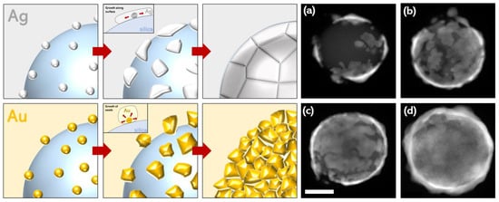 The synthesis of thin, continuous Ag or Au shells around a core is difficult because of the poor wettability of these metals on SiO2 surfaces. The shell formation typically proceeds through an island-growth mechanism, leading to inhomogeneities in surface coverage, as nucleation sites tend to grow isotropically rather than as a continuous layer on the SiO2 surface. The most common approach to synthesizing a silver shell is to reduce silver onto gold-seeded silica particles [6,19,21,28,29,30]. This approach has been used to produce an ultrathin shell (9.8 nm thick) thanks to the addition of a polymer additive (e.g., polyethylenimine) during the shell formation [19], which plays three different roles: facilitating shell growth, regulating the reaction rates, and stabilizing the particles. In practice, the polymer is used to slow the shell-growth reaction so that it occurs uniformly. However, this approach is limited by the continued presence of gold seeds within the shell, which detrimentally influences the optical properties of the nanoshell due to the interband transitions of Au [1,22], especially if it is very thin. Therefore, two main approaches have been developed to synthesize nanoshells made only of silver: direct- or seeded-growth synthesis.