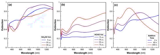 Effect of multiple parameters on the Ag-nanoshell synthesis. The UV–Vis–NIR spectra after the shell-growth step, prepared using different amounts of (a) ammonia, (b) formaldehyde, and (c) different times between the injection of formaldehyde and ammonia, all other conditions being equal.