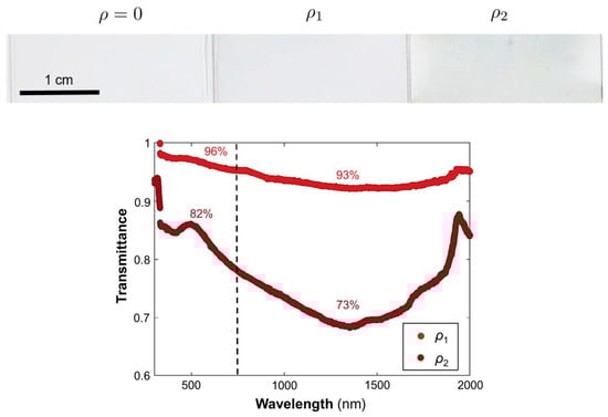 The nanoshells were dispersed in a thin polymer film deposited on a glass substrate by blade-coating. The optical properties of films doped with increasing amounts of particles were investigated. Figure 6 presents images of the films containing different particle densities (ρ0 = 0 μm−2, ρ1 = 3.3 μm−2, ρ2 = 10 μm−2), alongside their optical spectra. The reference sample (ρ0) exhibited high transparency in the visible range with a slight reduction in the NIR (not shown). By comparison, the films containing dispersions of the Ag nanoshells in the polymeric matrix exhibited a much greater difference in transmission between the visible and the NIR, efficiently reducing NIR transmittance. The attenuation band was wider and redshifted in comparison to the extinction of the nanoshells in solution. This shift was attributed to the change in the refractive index of the surrounding medium. Not surprisingly, the attenuation increased with increasing particle concentrations.