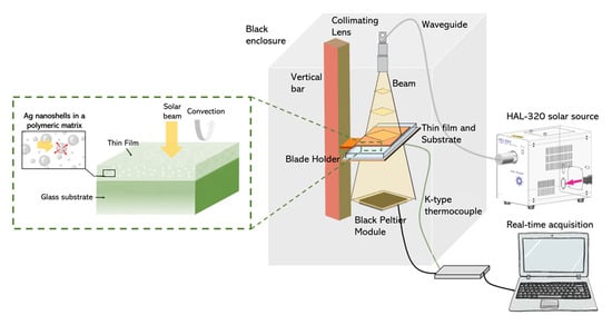 Thermal measurements of the thin films were recorded within an enclosure, in which the samples could be illuminated with a solar light source, as depicted in Scheme 1. A HAL-320 solar source (Asahi Spectra, CA, USA) was used to illuminate the composite films on a glass substrate, and its beam was directed at the upper panel of the enclosure using a waveguide and a collimating lens. A vertical bar with a mobile blade holder was used to place the films at a fixed distance of 27 cm from the lens. This distance, calibrated by the supplier of the solar source, corresponded to a distance at which the incident beam possessed an intensity I0 = 1000 W⋅m−2 (as the beam was divergent). The enclosure ensured that no external radiation could illuminate the thin film. As the incoming light illuminated the sample, the thin film absorbed a section of the solar spectrum, and the glass substrate absorbed some of the UV light, resulting in a temperature increase in both the film and the glass substrate. The system was allowed to stabilize until a steady state was reached. The temperature was measured above the film and below the glass slide (we only report the latter in the following sections). A K-type thermocouple was fixed to the rear face of the glass substrate, and temperature changes were acquired using a 24-bit National Instruments module (National Instruments, TX, USA) using LabView software. The thin-film temperature was more complicated to measure as the tip of the thermocouple was greater than the thicknesses of the thin films, leading to uncertainty in the measurements. However, as the thickness of the glass substrate was approximately 1 mm, its temperature could still be accurately measured, providing useful information on the heat generation within the thin film. Additionally, a high-pass optical filter was used after the collimating lens to block UV and visible light, letting only the NIR part of the solar spectrum reach the thin film. For the most advanced characterization, a Peltier module was used to collect the power transmitted across the film on glass, along with the thermal emission.