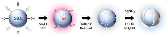 For direct synthesis, several one- or two-step approaches were developed using different physicochemical mechanisms, such as electroless plating [20,22,28], a template-activated strategy [31], methods using the Tollens’ process [32], ultrasonic electrodeposition [24], layer-by-layer deposition [14,23], the amine-assisted reduction of silver onto thiol-functionalized silica particles [11,12,13], and a ‘rapid chemical method’ using neither coupling agents nor a functionalized core [10]. The short reaction time of these approaches makes them very convenient; however, the fabricated shells are usually thicker than 20 nm.