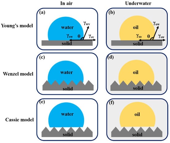 The separation process of oil and water highly relates to the wettability of the liquid (water or oil) on the interface of the solid and air. When the wettability behavior occurs on an ideal smooth solid surface, the Young’s model is usually used to calculate the contact angle () [] (Figure 2a):