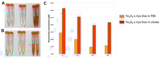Toderascu, L.I.; Sima, L.E.; Orobeti, S.; Florian, P.E.; Icriverzi, M.; Maraloiu, V.-A.; Comanescu, C.; Iacob, N.; Kuncser, V.; Antohe, I.; et al. Synthesis and Anti-Melanoma Activity of L-Cysteine-Coated Iron Oxide Nanoparticles Loaded with Doxorubicin. Nanomaterials 2023, 13, 621. https://doi.org/10.3390/nano13040621