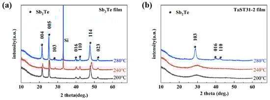 The lattice information of the Sb3Te1 and TaST31-2 films were characterized by XRD measurements, as shown in Figure 2a,b. The Sb3Te1 and TaST21-2 films with a thickness of 150 nm were annealed in N2 at 200 °C, 240 °C, and 280 °C for 5 min. The diffraction peaks of Sb3Te1 film appeared at 200 °C, which is corresponding to the hexagonal Sb2Te phase. As observed in Figure 2b, the crystallization of TaST31-2 film is delayed, and the diffraction peak appeared at 240 °C. By comparing the crystal orientation indexes in Figure 2a,b, the TaST31-2 film shows an increase in the intensity of the 103 peak and a decrease in the intensity of the 004 and 005 peaks compared to the pure Sb3Te1 films, while the 114 and 023 peaks no longer appear. It can clearly be observed that the diffraction peaks of the Ta-doped Sb3Te1 film broaden, but there are no diffraction peaks of the metal Ta or Ta-containing metal compounds, and no isolated Sb []. The results of the XRD curves indicate that the main crystal structure of the Ta-doped Sb3Te1 film has not changed. Moreover, the half-peak width of the Ta-doped Sb3Te1 film has become larger, which means that the grains have been refined.