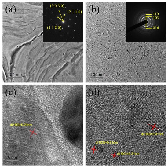 Transmission electron microscopy (TEM) enables a more visual observation of the grain size and crystalline phase. The test samples for TEM are 30 nm thick films of Sb3Te1 and TaST31-2 deposited on copper grids, which can be directly used for TEM observation and analysis. All samples were annealed in N2 at 280 °C for 5 min. BF TEM images of Sb3Te1 and TaST31-2 films and their associated SAED patterns are shown in Figure 3a,b, respectively. Figure 3c,d are HRTEM images of Sb3Te1 and TaST31-2 films, respectively. The comparison of BF images shows that the grain size of TaST31-2 film is significantly smaller than that of the Sb3Te1 film. It proves that after Ta doping, the crystallization behaviour of Sb3Te1 switches from being growth-dominated to nucleation-dominated. Meanwhile, the SAED pattern of the Sb3Te1 film shows single crystal diffraction spots, indicating that it has grown into large grains. In contrast, the intensity of diffraction rings that belong to 110, 103, and 016 crystallographic planes of hexagonal structure of Sb2Te emerged in the corresponding SAED pattern of TaST31-2 film and showed a small degree of discontinuity, further explaining the inhibition effect of Ta on grains []. It also can be found that the grains become uniform on the HRTEM images of TaST31-2 films. Sb3Te1 films have a grain size of at least 100 nm, which is reduced to 5–10 nm after Ta doping. Therefore, it is concluded that the grain size decreases and no other phases in Ta doping Sb3Te1 film. The small size of the grain contributes to reducing the thermal conductivity and resistance drift as well as the formation of a homogeneous phase, which helps to improve the heating efficiency and the reliability of the device [].